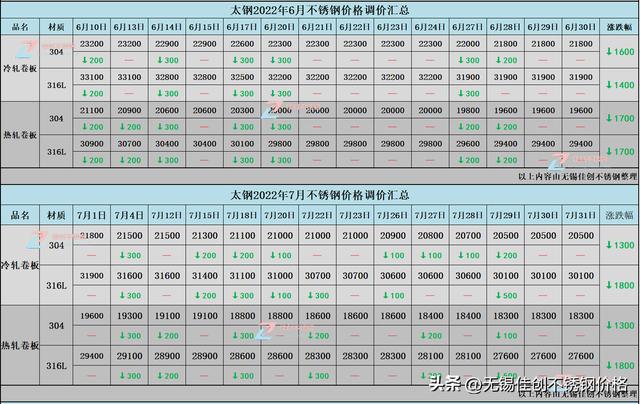 2022年6-7月太鋼不銹鋼訂貨價格漲跌對照表: