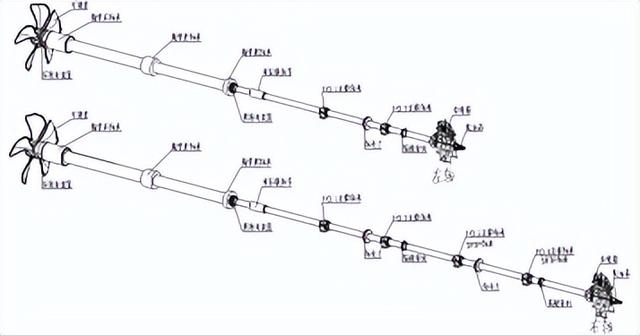 本船軸系主要由主機齒輪箱、軸帶發電機、中間軸、尾軸、調距槳以及必須的軸系附件組成。主機與齒輪箱及軸帶發電機通過高彈聯軸器連接,以降低振動及噪音,軸與軸之間為法蘭及液壓聯軸器剛性連接。左側軸系長度約37米,設置3只尾管軸承、2只支撐軸承、1只隔艙密封裝置;右側軸系長度約50米,設置3只尾管軸承、4只支撐軸承、2只隔艙密封裝置。兩側軸系均為細長軸,兩側軸線傾角1.172°,具有約束點多,安裝施工難度大的特點。具體布置見圖1。